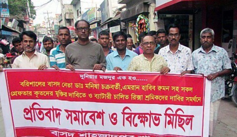 নিজস্ব প্রতিনিধি : বিকল্প কর্মসংস্থানের ব্যবস্থা না করে বরিশালে আড়াই হাজার অটো রিক্সা বন্ধের প্রতিবাদ করায় বাসদ নেতা ডাঃ মনিষা চক্রবর্তী, ছাত্রফন্ট নেতা এমরান হাবিব রুমনসহ গ্রেফতারকৃত ২০ জন নেতা-কর্মী ও শ্রমিকদের মুক্তির দাবিতে বাংলাদেশের সমাজতান্ত্রিক দল-বাসদ, শাহজাদপুর উপজেলা শাখার পক্ষ থেকে রোববার বিকেলে এক বিক্ষোভ মিছিল শেষে মানববন্ধন কর্মসূচি পালিত হয়। বিক্ষোভ মিছিলটি পৌর এলাকার বিভিন্ন সড়ক প্রদক্ষিণ শেষে মনিরামপুর বাজারে এক মানববন্ধন কর্মসূচি চলাকালে বক্তব্য রাখেন, বাসদ নেতা এ্যাডভোকেট আনোয়ার হোসেন, আতাউর রহমান পিন্টু, এ্যাডভোকেট কবীর আজমল বিপুল, সাংবাদিক সাগর বসাক, শ্রমিক নেতা আব্দুল মজিদ, আব্দুল আলিম, নুর ইসলাম, সোহরাব আলী প্রমুখ। বক্তারা বলেন, অবিলম্বে গ্রেফতারকৃত বাসদ নেতৃবৃন্দ ও শ্রমিকদের মুক্তি না দিলে জোর আন্দোলন গড়ে তোলা হবে।