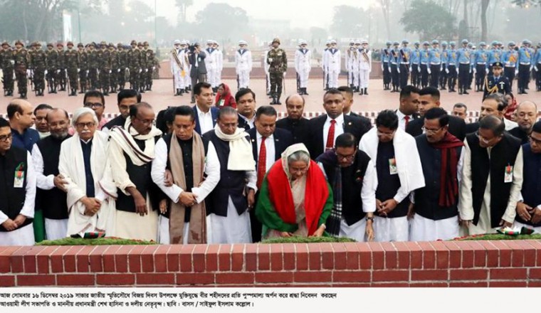 প্রধানমন্ত্রী শেখ হাসিনা ৪৯তম বিজয় দিবস উপলক্ষে একাত্তরের মুক্তিযুদ্ধের মহান শহীদদের প্রতি শ্রদ্ধা জানিয়েছেন। আজ ভোরে সাভার জাতীয় স্মৃতিসৌধের বেদীতে পুষ্পস্তবক অর্পণের মাধ্যমে জাতীর পক্ষ থেকে প্রধানমন্ত্রী শেখ হাসিনা জাতির সূর্য সন্তানদের প্রতি শ্রদ্ধা জানান। জাতীয় স্মৃতিসৌধের বেদীতে পুষ্পস্তবক অর্পণের পর মুক্তিযুদ্ধের শহীদদের স্মৃতির প্রতি সম্মান জানিয়ে তিনি সেখানে কিছুক্ষণ নীরবে দাঁড়িয়ে থাকেন।