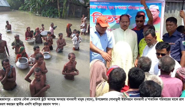 শামছুর রহমান শিশির, শাহজাদপুর (সিরাজগঞ্জ) থেকে : শুষ্ক মৌসুমের মরা যমুনায় ডেকেছে বান! অকষ্মাৎ যমুনার বানের পানি দু’কূল ছাপিয়ে নদী তীরবর্তী এলাকাগুলোর ঘরবাড়ি, ফসল, নলকূপ ও গ্রামীন জনপদকে প্লাবিত করেছে। শাহজাদপুরের বিভিন্ন এলাকা, যমুনার বিস্তৃত চরাঞ্চল, সিরাজগঞ্জের কাজিপুর, চৌহালী, এনায়েতপুর, জামালপুর, মানিকগঞ্জ ও টাঙ্গাইল জেলার যমুনা নদী তীরবর্তী চরাঞ্চলসহ বিস্তৃর্ণ এলাকা অকষ্মাৎ বানের পানিতে তলিয়ে যাওয়ায় বন্যা পরিস্থিতি ভয়াবহতায় রূপ নিয়েছে! এতে যমুনা তীরবর্তী লাখ লাখ মানুষ আতঙ্কিত হয়ে পড়েছে। বিভিন্ন পয়েন্টে যমুনার বানের পানি বিপদ সীমার অনেক উপর দিয়ে প্রবাহিত হওয়ায় নদী তীরের পার্শ্ববর্তী এলাকাগুলোর মাঠের ফসল, ঘাট ও জনপদ প্লাবিত হয়েছে এবং প্রতিদিনই নতুন নতুন এলাকা বানের পানিতে তলিয়ে যাচ্ছে। এতে অসংখ্য পরিবার পানিবন্দী হয়ে দুর্বিসহ জীবনযাপন করছে। হঠাৎ বানের পানিতে চরাঞ্চলসহ বিভিন্ন স্থানে নলকূপ ডুবে যাওয়ায় যমুনা তীরবর্তী বিভিন্ন এলাকায় বিশুদ্ধ পানির তীব্র সংকট সৃষ্টি হয়েছে। এসব এলাকায় পয়োঃনিষ্কাষণ ব্যবস্থা লাজুক আকার ধারণ করায় ডায়রিয়া, আমাশয়, উদরাময়, চর্মরোগসহ পানিবাহিত নানা রোগে আক্রান্ত হচ্ছে যমুনাপাড়ের অগণিত জনমানুষ।এসব এলাকায় অবিলম্বে বিশুদ্ধ পানি,খাবার,ঔষধসহ ত্রাণ বিতরণ অতীব জরুরী হয়ে পড়েছে। গত তিন সপ্তাহে সোনাতনী ইউনিয়নের দুটি গ্রামের প্রায় সহস্রাধিক ঘরবাড়ি যমুনার কড়াল গ্রাসে বিলীন হয়েছেঝ। সোনাতুনীর শ্রীপুর গ্রামের শতাধিক পরিবার, বানতিয়ার ২ শতাধিক, চামতাঁরা ৩ শতাধিক, ধীতপুর গ্রামের দেড় শতাধিক পরিবার এবং কৈজুরী ইউনিয়নের হাটপাচিল গ্রামের শতাধিক পরিবার সরাসরি যমুনার ভাঙ্গণে ক্ষতিগ্রস্থ হয়েছে। আজ রোববার বিকেলে যমুনার দুর্গম চরাঞ্চল সোনাতুনী ইউনিয়নের বানতিয়ার চরে ক্ষতিগ্রস্থ ওই এলাকার প্রায় ৫’শতাধিক পরিবারের সদস্যদের মধ্যে প্রধান অতিথি হিসেবে উপস্থিত থেকে জনপ্রতি ১০ কেজি চাউল ও নগদ অর্থ, পানি বিশুদ্ধকরণ ট্যাবলেট ও খাবার স্যালাইন ত্রাণ বিতরণ করেছেন স্থানীয় সংসদ সদস্য আলহাজ্ব হাসিবুর রহমান স্বপন। সোনাতুনী ইউপি চেয়ারম্যান লুৎফর রহমানের সভাপতিত্বে অনুষ্ঠিত ত্রাণ বিতরণ ওই কার্যক্রমে, বিশেষ অতিথি ছিলেন শাহজাদপুর উপজেলা পরিষদ চেয়ারম্যান প্রফেসর আজাদ রহমান, উপজেলা নির্বাহী অফিসার আলীমুন রাজীব, থানার অফিসার ইনচার্জ মো: খাজা গোলাম কিবরিয়া, উপজেলা আওয়ামী লীগের যুগ্ম-সাধারণ সম্পাদক ও কৈজুরী ইউনিয়র পরিষদ চেয়ারম্যান সাইফুল ইসলাম, শাহজাদপুর পৌর আওয়ামী লীগের সাধারণ সম্পাদক আমিরুল ইসলাম শাহু, সোনাতুনী ইউনিয়ন আ’লীগের সভাপতি মতুর্জ আলী, সাধারণ সম্পাদক আয়ে